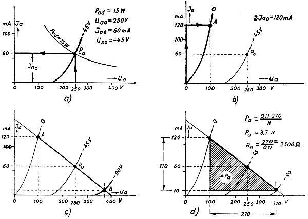 Żeby nie zaciemniać rysunku narysowano tylko trzy charakterystyki anodowe, mianowicie charakterystykę zerową (Us = 0), charakterystykę przechodzącą przez punkt początkowy pracy Po (Us = -45V) i charakterystykę dla ujemnego napięcia siatki Us = -90V. Punkt początkowy pracy lampy Po leży na przecięciu się prostej pionowej wykreślonej z punktu Uao = 250V na osi napięć, z hyperbolą mocy admisyjnej. Prowadząc przez punkt Po prostą poziomą aż do przecięcia się z osią prądową odczytujemy wartość prądu spoczynkowego Iao = 60mA. Następnie szukamy wśród rodziny charakterystyk anodowych lampy tę charakterystykę, która przechodzi przez punkt Po i odczytujemy ujemne napięcie siatkowe, które tej charakterystyce odpowiada. W naszym przypadku jest to charakterystyka należąca do napięcia siatkowego Us = -45V. Tak duże ujemne napięcie musimy przyłożyć do siatki lampy AD1, aby przy napięciu anodowym 250V otrzymać prąd anodowy Iao = 60mA. Następny etap to wyznaczenie prostej roboczej odpowiadającej optymalnemu oporowi pracy lampy. Prosta robocza przechodzić musi przez punkt spoczynkowy Po. Poza tym nachylenie tej prostej w stosunku do osi poziomej musi być tak dobrane, aby moc otrzymana na oporze anodowym podczas maksymalnego wysterowania lampy była największa. Aby znaleźć to optymalne nachylenie prostej roboczej rozumujemy w sposób następujący.