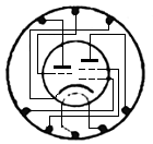 Połączenia elektrod lampy ECL11 z nóżkami w jej cokole, widoczne od spodu cokołu, przedstawia rys.1.