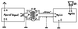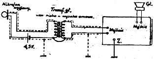 Uzwojenie niskoomowe, które przyłączane bywa zwykle do cewki drgającej głośnika, łączy się wtedy z biegunami mikrofonu, zaś wysokoomowe (włączone do „wejścia” wzmacniacza lub aparatu) – z „wejściem” wzmacniacza. Na zamieszczonym niżej schemacie (rys. 10) widzimy, że w obwodzie mikrofonu znajduje się bateryjka elektryczna. Potrzebna jest ona dla działania mikrofonu węglowego i miże być od latarki kieszonkowej o napięciu od 3 do 4,5 wolta.