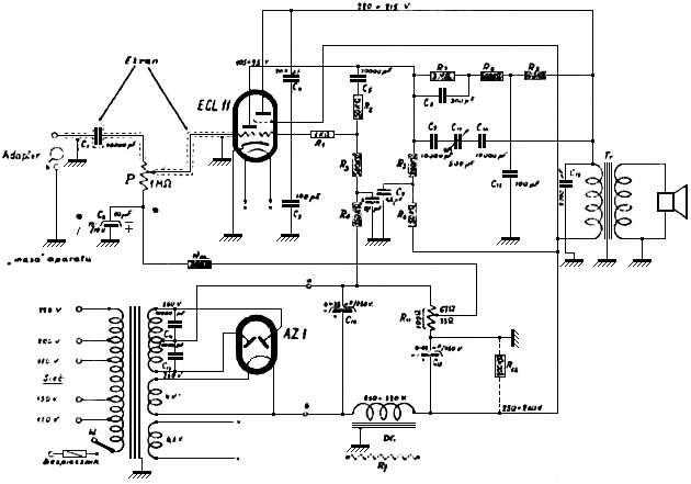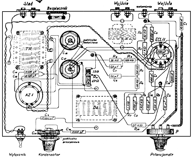 Część wzmacniająca posiada „wejście” wysokoomowe. Z gniazdek „wejściowych” wzmacniacza napięcia o częstotliwościach akustycznych otrzymane z adaptera, aparatu lub mikrofonu, doprowadzone zostają na siatkę sterującą triody lampy ECL11 poprzez kondensator C1=10.000 pikofaradów i potencjometr P=1M (Megoma), którym reguluje się „siłę głosu” wzmacnianej audycji. Po pierwszym wzmocnieniu w „triodzie” napięcia, powstające na oporze pracy Rs=200.000 omów, znajdującym się w jej obwodzie anodowym, zostają skierowane poprzez kondensator stały C5=10.000pF, opór R2=50.000 omów i opór R1=1.000 omów – do siatki sterującej pentody. Ponieważ lampa typu ECL11 często wpada w oscylacje objawiające się silnym gwizdem, buczeniem lub pukaniem, przeto celem uniknięcia ich powstawania łączy się siatkę sterującą pentody, z jej anodą kondensatorem stałym C4=200pF, oraz z „masą aparatu” kondensatorem stałym C3=100pF. Wymienione wyżej opory R1 i R2, włączone w obwód siatki sterującej stanowią również zawór dla napięć zakłócających. Opór upływowy R3=0,3M w obwodzie siatki sterującej pentody połączony jest poprzez opór R4=130K ze środkiem uzwojenia anodowego na transformatorze sieciowym.