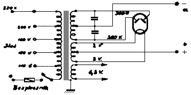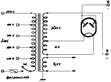 Wzmacniacz „ECL” jest zasilany prądem zmiennym z sieci oświetleniowej. Lampy więc żarzy się prądem zmiennym o zniżonym na transformatorze sieciowym do potrzebnej wysokości – napięciu. Zasilanie anod lampy wzmacniającej prądem „stałym” odbywa się za pomocą prostownika lampowego i filtru wygładzającego wyprostowane napięcie zmienne, które również otrzymuje się z odpowiedniego uzwojenia tego samego transformatora sieciowego. We wzmacniaczu modelowym użyto transformator sieciowy mający dwa uzwojenia tzw. „anodowe” dostarczające napięć dwa razy po 360 woltów i pozwalające na „dwupołówkowe” prostowanie prądu za pomocą lampy AZ1. Gdyby jednak nabycie takiego transformatora sieciowego sprawiło trudność, można zastosować transformator posiadający jedno tylko uzwojenie „anodowe”, które pozwoli na prostowanie „jednopołówkowe”. W tym przypadku schemat zasilacza z rys.3, między gniazdkami przyłączonymi z sieci i punktami „a” i „b” zmieni się tak, jak to pokazuje rys.4.