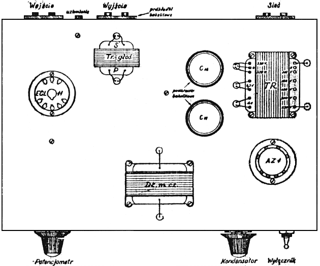 Dokonać tego można łącząc „ujemny” biegun woltomierza na „prąd stały” o zakresie 300 lub więcej woltów, z metalową podstawą („masą”) wzmacniacza, zaś jego biegun „dodatni” – z odpowiednimi sprężynkami w podstawie lampy ECL11. Pomiary te wykonywać trzeba ze schematami w ręku aby uniknąć pomyłek przy przyłączaniu woltomierza. Jeżeli Czytelnik nie posiada odpowiedniego woltomierza to można te ostatnie pomiary pominąć, sprawdzając jednak dokładnie połączenia ze schematami. Po ponownym wyłączeniu wzmacniacza z sieci, włożeniu lampy ECL11 do podstawki i włączeniu go z powrotem do sieci, wzmacniacz powinien dawać słyszalny szum z głośnika który będzie tym silniejszy im większe będzie na nim wzmocnienie uzyskiwane przez pokręcenie potencjometru „P” w prawo.