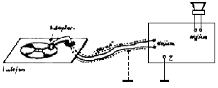 Po tym sprawdzeniu wzmacniacz można już przyłączyć do adaptera patefonowego, uważając jednak aby „ekran” znajdujący się na przewodach odprowadzonych, od niego (czasem również i przewód połączony z „ekranem” włożony był do tego gniazdka „wejściowego”, które łączy się z podstawą („masą”) wzmacniacza (patrz rys. 8).