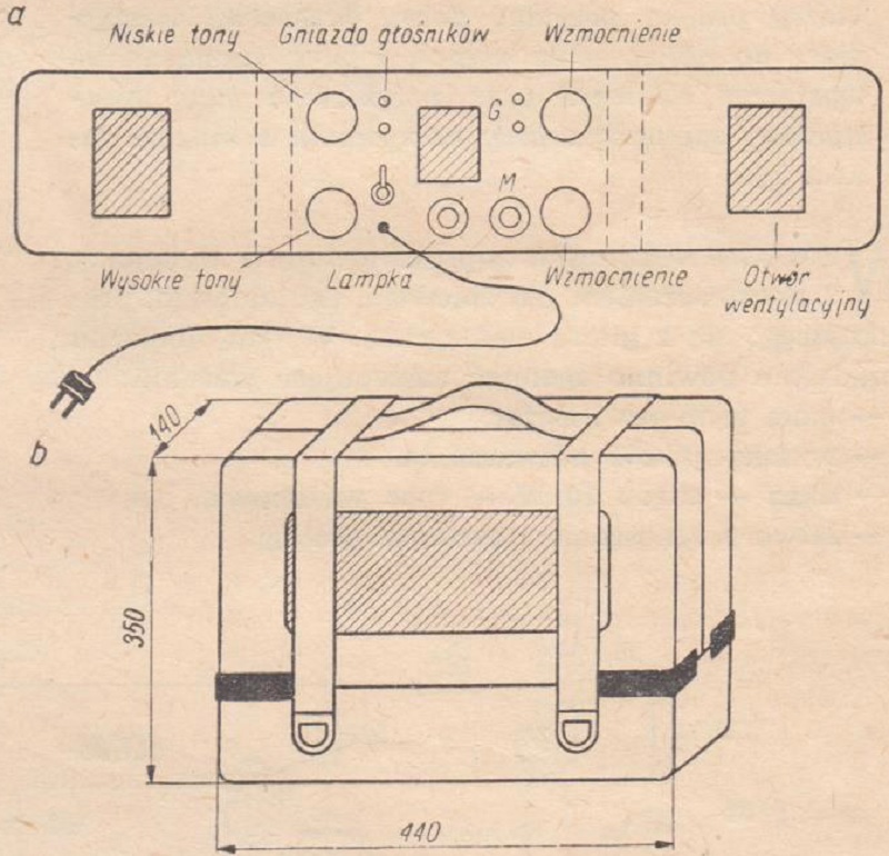 Opisany poniżej wzmacniacz jest przykładem dobrze przemyślanej konstrukcji, odpowiadającej określonemu przeznaczeniu. Prosty, ale pełnowartościowy układ, należyte wykorzystanie mocy dzięki zastosowaniu sprawnych głośników krajowych, dobre przystosowanie do przenoszenia, tanie i efektowne wykończenie - oto główne cechy urządzenia. Budowę tego urządzenia możemy zalecić wszystkim, którzy pragną posiadać dobry przenośny wzmacniacz do odtwarzania nagrań z płyt, wzmacniania występów solowych oraz zwiększenia mocy akustycznej odbiornika przy korzystaniu z muzyki tanecznej.