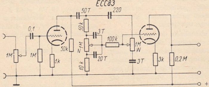 W położeniu górnym suwaka potencjometru "W" mamy podniesione tony wysokie, bowiem oporności 50kΩ i 100kΩ jedynie dla wielkich częstotliwości są bocznikowane kondensatorem 200pF. W położeniu dolnym suwaka tego potencjometru tony wysokie są obcięte, powstaje dzielnik napięcia oporowo-pojemnościowy składający się z oporności 100kΩ i kondensatora 23000pF, który obcina wielkie częstotliwości pasma.