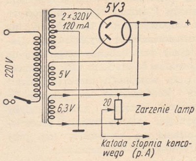 Jak widać jest to zasilacz zupełnie konwencjonalny. Filtr składa się (rys. 6) z dławika 5÷10H i dwóch kondensatorów elektrolitycznych po 32μF. Dla usunięcia przydźwięku sieci przedostającego się od strony katod, uzwojenie żarzenia lamp jest symetryzowane za pomocą potencjometru 50Ω, którego środek ma napięcie około +12V (katody lamp końcowych). Ma to na celu zmniejszenie emisji włókno-katoda.