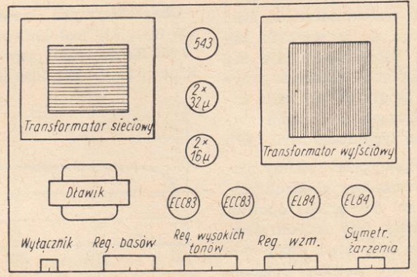 Po wykonaniu (starannym) montażu należy również starannie sprawdzić układ, a następnie włożyć w podstawkę lampę prostowniczą i po włączeniu wzmacniacza do sieci sprawdzić, czy na łączówkach żarzenia lamp wzmacniacza nie ma wysokiego napięcia. Należy tu przypomnieć, że lampy ECC83 mają żarzenie przyłączone do innych styków niż inne typy lamp serii "80".