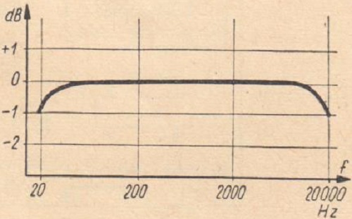 Wzmacniacz obciążony opornością rzeczywistą 5Ω. Charakterystyka częstotliwościowa (rys. 11) jest liniowa od 20Hz do 20000Hz (-1dB) przy mocy wyjściowej 10VA dla 1000Hz.