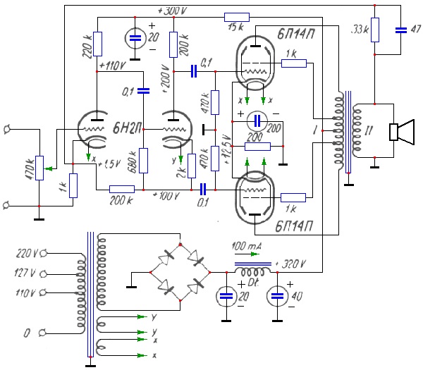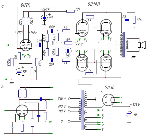 Do zasilania wzmacniacza służy prostownik z lampą 5Ц3C. Transformator tego prostownika wykonany jest na rdzeniu płaszczowym 40x50 i ma następujące uzwojenia: uzwojenie pierwotne posiada 220 + 34 + 186 zwojów nawiniętych drutem średnicy 0,8; uzwojenie wtórne - 2 x 700 zwojów nawiniętych drutem średnicy 0,3; uzwojenie "xx" - 11 zwojów nawiniętych drutem średnicy 1,5; uzwojenia "yy" i "zz" - po 13,5 zwojów drutem średnicy 1,2.