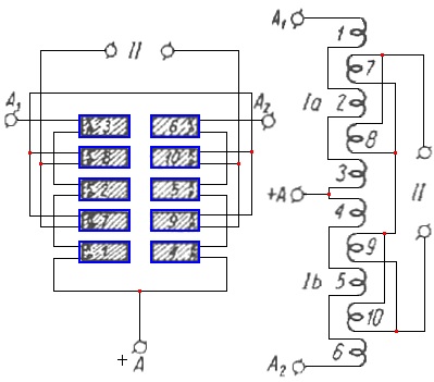 W praktyce transformator taki uzwaja się następująco: nawija się początkowo sekcję 1, 7, 2, 8, 3 a następnie zdejmuje się korpus z nawijarki, obraca o 180stopni i nawija się sekcje 4, 9, 5, 10, 6. Następnie łączy się odpowiednio początki i końce sekcji według schematu.