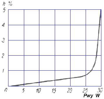 Na schemacie rys. 9 przedstawiono układ trzystopniowego wzmacniacza przeciwsobnego o mocy 20W. Współczynnik zawartości harmonicznych nie przekracza 1,2%. Czułość wzmacniacza: 0,5V. Charakterystyka zniekształceń nieliniowych jest przedstawiona na rys. 10. Charakterystyka częstotliwościowa jest równomierna od 20Hz do 25kHz. Układ odwracający fazę został opracowany pod kątem zapewnienia dobrej symetrii napięcia wyjściowego w szerokim zakresie częstotliwości. W stopniu końcowym pracują po dwie lampy 6P 14P połączone równolegle, w klasie AB. Ujemne napięcie dla tych lamp uzyskuje się automatycznie na wspólnym oporniku. Oporniki w siatkach sterujących zapobiegają powstawaniu szkodliwych oscylacji. Pętla ujemnego sprzężenia zwrotnego obejmuje cały wzmacniacz.