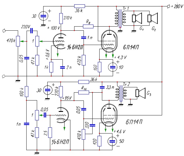 Rozdział kanałów następuje po wspólnym regulatorze siły głosu. Osłabienie małych częstotliwości w kanale wysokotonowym (na schemacie górnym) następuje wskutek małej pojemności kondensatora blokującego opornik katodowy oraz niewielkich pojemności kondensatorów sprzęgających.