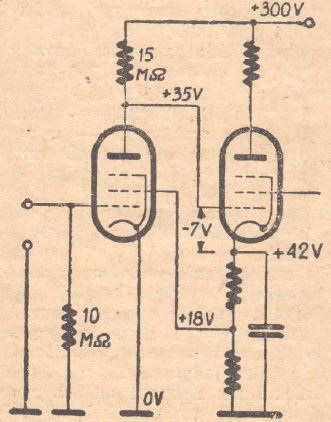 Układ wzmacniacza wskazany na rys. 1 nie posiada żadnego elementu sprzęgającego pomiędzy anodą stopnia pierwszego, a siatką stopnia drugiego. Jest to więc układ nazywany dotychczas wzmacniaczem prądu stałego. Działanie jego będzie prawidłowe, jeśli potencjał katody drugiej lampy względem masy będzie wyższy od potencjału anody stopnia pierwszego, gdyż w ten sposób siatka drugiej lampy będzie ujemną względem swej katody. W zwykłym jednak układzie anoda lampy sterującej wykazuje napięcie względem masy rzędu setki woltów, wynika więc stąd konieczność stosowania wysokiego stosunkowo napięcia zasilającego. Napięcie ponadto powinno być stabilizowane, gdyż zmiana napięcia o np. 10 woltów pociąga za sobą zmianę o kilka woltów, co może mieć bardzo nieprzyjemne skutki przy nowoczesnych lampach głośnikowych o dużym nachyleniu charakterystyki. Układów takich unikano więc o ile tylko możliwe, a tam gdzie były niezbędne, jak np. w niektórych układach pomiarowych, należało przedsiębrać pewne dość skomplikowane środki zabezpieczające.