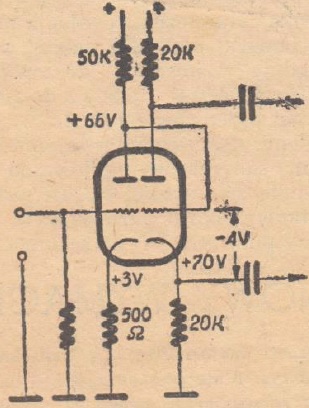 Wartości z rys. 1 wskazują, że pierwsza lampa pracuje przy bardzo niskim napięciu na swej anodzie. Oporność anodowa jest tu bowiem przeszło 50 razy większa niż zwykle, zaś napięcie ekranu odpowiednio niższe od napięcia anodowego. Uzyskuje się w ten sposób pewną oszczędność na poborze prądu, ale jednocześnie wyzyskuje się do maksimum, przynajmniej w tych warunkach, zdolności amplifikacyjne lampy.