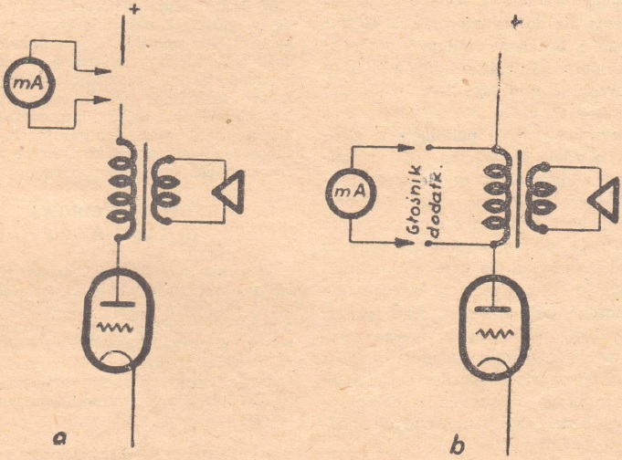 Większość odbiorników ma wyprowadzone i dostępne z zewnątrz gniazdka głośnika dodatkowego i najczęściej gniazdka te połączone równolegle do pierwotnego uzwojenia transformatora głośnikowego. Oporność tego uzwojenia, zmierzona omomierzem prądu stałego, jest rzędu od 100 do 500Ω. Jeżeli więc do tych gniazdek dołączymy miliamperomierz, to popłynie przezeń cały prawie prąd anodowy lampy, jego oporność wynosi bowiem zaledwie ułamek oma.