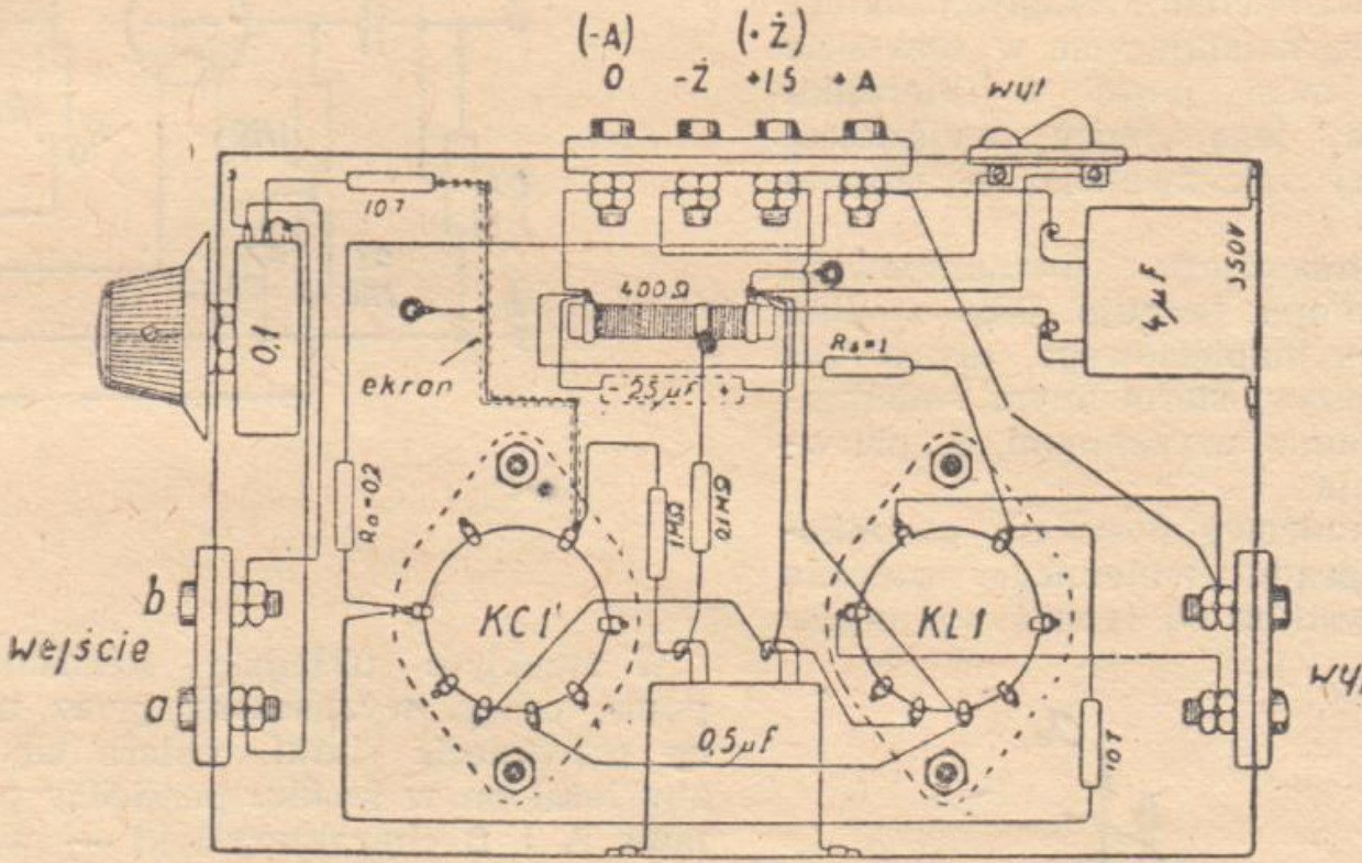Taką moc w przypadku użycia we wzmacniaczu lampy głośnikowej typu KL1 osiąga się wg. danych katalogowych tej lampy - przez zastosowanie oporności zewnętrznej Ra=14000 omów. Wartość Ra dla innych typów lamp wyjściowych, jakie mogą być użyte zamiast przewidzianego przez nas, trzeba wziąć także z katalogu. Odnoszą się one do pierwotnego uzwojenia transformatora, obciążonego głośnikiem po stronie wtórnej.