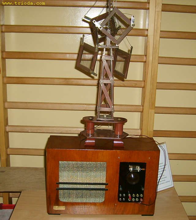 Producent: Radjofon Polska Fabryka Odbiorników Radiowych, typ: Super Detektor Eksportowy. Odbiornik detektorowy. Rok produkcji 1939. Uwagi: Poznań z wbudowanym głośnikiem, 2-zakresowy. Eksponat z kolekcji Pana Henryka Berezowskiego. Konstrukcja anteny powala z nóg