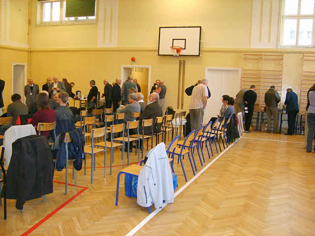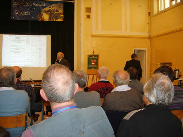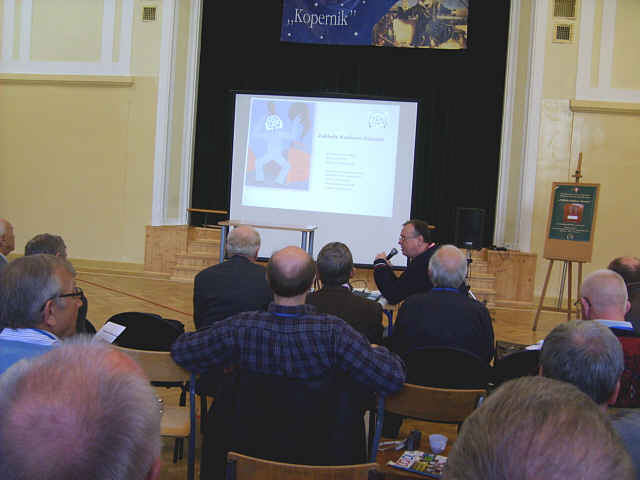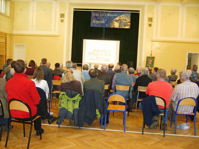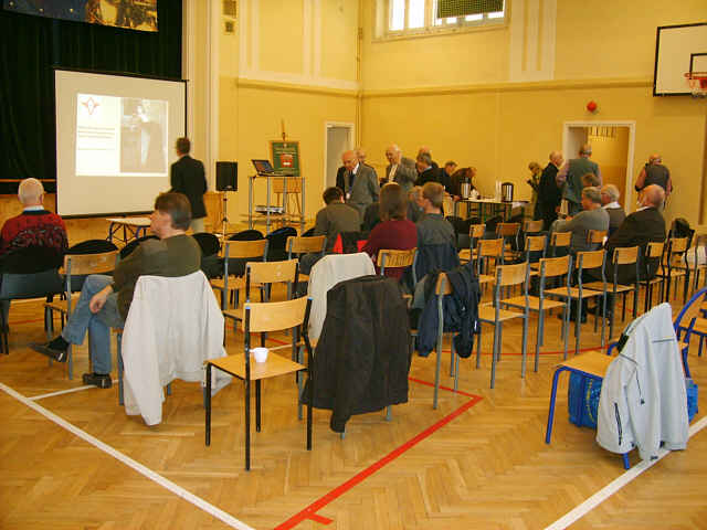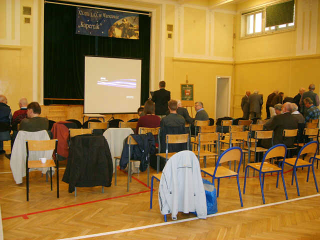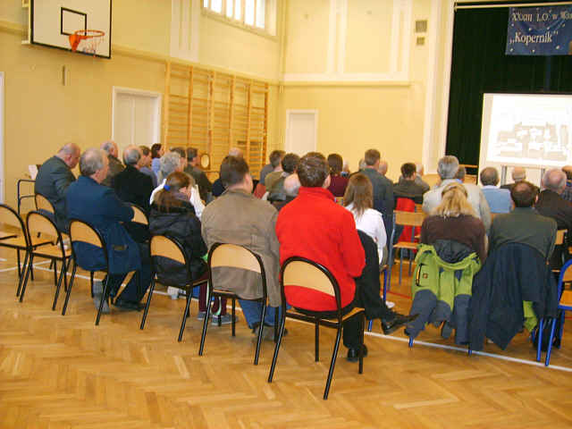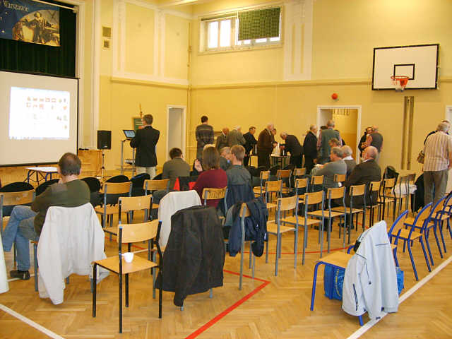 . Na sali było już sporo osób. Na Fot. 1 i Fot. 2 widać przy rzutniku, stojącego tyłem do widowni Pana Mariusza Matejczyka (współorganizatora spotkania), który przygotowuje komputer do prezentacji. Jego walce ze sprzętem z zainteresowaniem przygląda się kilka osób, które zapobiegliwie zajęły najlepsze miejsca. Część miejsc "rezerwują" kurtki zawieszone na oparciach krzeseł