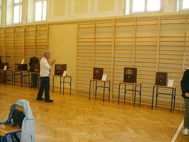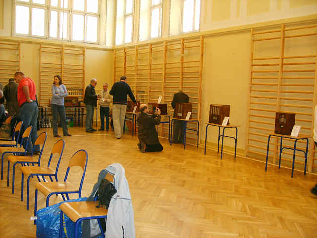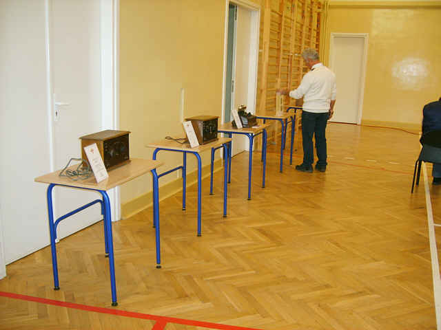 Jak wspomniałem, na sali obrad zorganizowano ekspozycję tematyczną. Pod ścianami sali umieszczono stoliki z eksponatami, czyli radiami firmy Natawis. Poniższą fotografię udało mi się zrobić tuż po przyjściu na spotkanie. Miałem szczęście, gdyż już po kilku minutach zrobiło się tłoczno i nie było już więcej okazji aby jednym ujęciem "złapać w kadrze" kilka niezasłoniętych stolików jednocześnie.