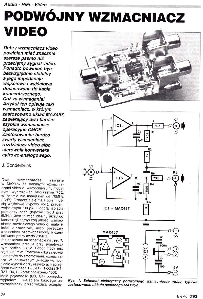 Dobry wzmacniacz video powinien mieć znacznie szersze pasmo niż przeciętny sygnał video. Ponadto powinien być bezwzględnie stabilny a jego impedancja wejściowa i wyjściowa dopasowana do kabla konsentrycznego. Cóż za wymagania! Artykuł ten opisuje taki wzmacniacz, w którym zastosowano układ MAX457, zawierający dwa bardzo szybkie wzmacniacze operacyjne CMOS. Zastosowania: bardzo zwarty wzmacniacz rozdzielczy video albo sterownik konwertera cyfrowo-analogowego.