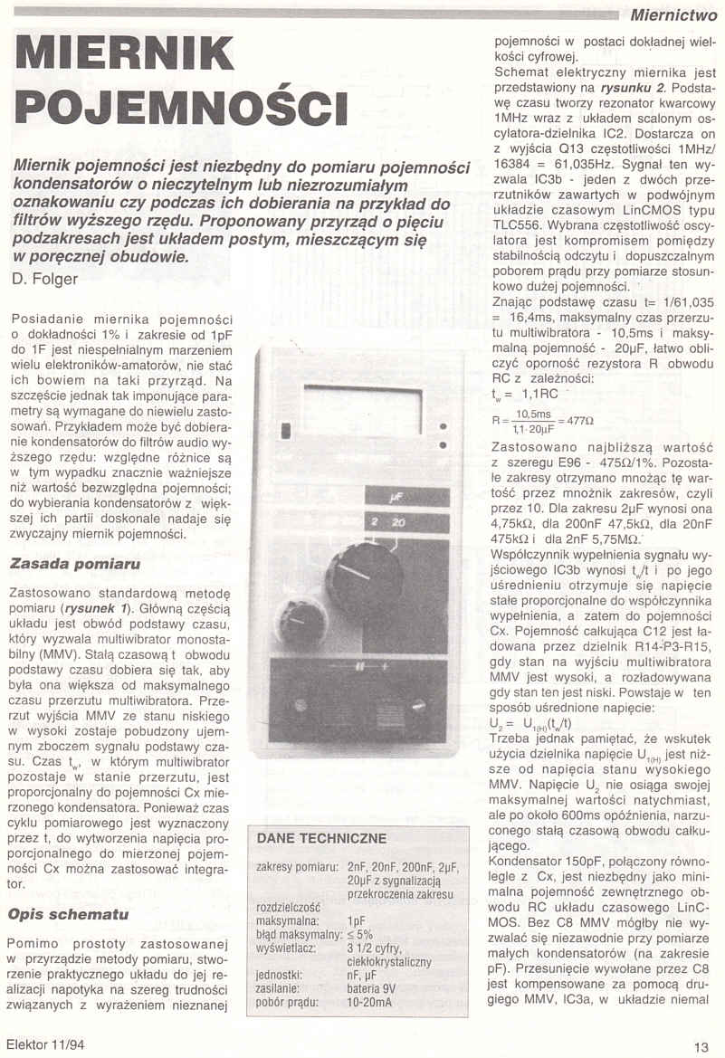 Miernik pojemności jest niezbędny do pomiaru pojemności kondensatorów o nieczytelnych lub niezrozumiałym oznakowaniu czy podczas ich dobierania na przykład do filtrów wyższego rzędu. Proponowany przyrząd o pięciu podzakresach jest układem prostym, mieszczącym się w poręcznej obudowie.