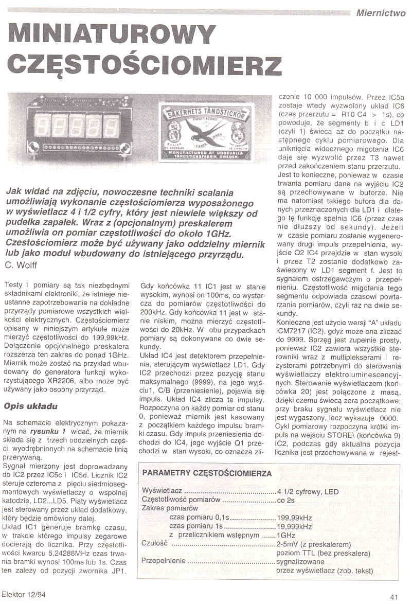 Jak widać na zdjęciu, nowoczesne techniki scalania umożliwiają wykonanie częstościomierza wyposażonego w wyświetlacz 4 i 1/2 cyfry, który jest niewiele większy od pudełka zapałek. Wraz z (opcjonalnym) preskalerem umożliwia on pomiar częstotliwości do około 1GHz. Częstościomierz może być używany jako oddzielny miernik lub jako moduł wbudowany do istniejącego przyrządu.