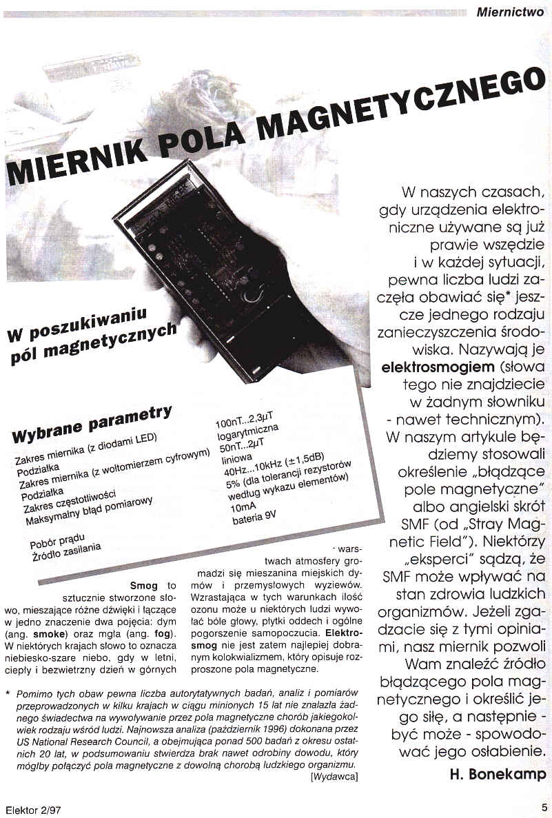 W naszych czasach, gdy urządzenia elektroniczne używane są już prawie wszędzie i w każdej sytuacji, pewna liczba ludzi zaczęła obawiać się jeszcze jednego rodzaju zanieczyszczenia środowiska. Nazywają je elektrosmogiem (słowa tego nie znajdziecie w żadnym słowniku - nawet technicznym). W naszym artykule będziemy stosowali określenie "błądzące pole magnetyczne" albo angielski skrót SMF (od "Stray Magnetic Field"). Niektórzy "eksperci" sądzą, że SMF może wpływać na stan zdrowia ludzkich organizmów. Jeżeli zgadzacie się z tymi opiniami, nasz miernik pozwoli Wam znaleźć źródło błądzącego pola magnetycznego i określić jego siłę, a następnie - być może - spowodować jego osłabienie.
