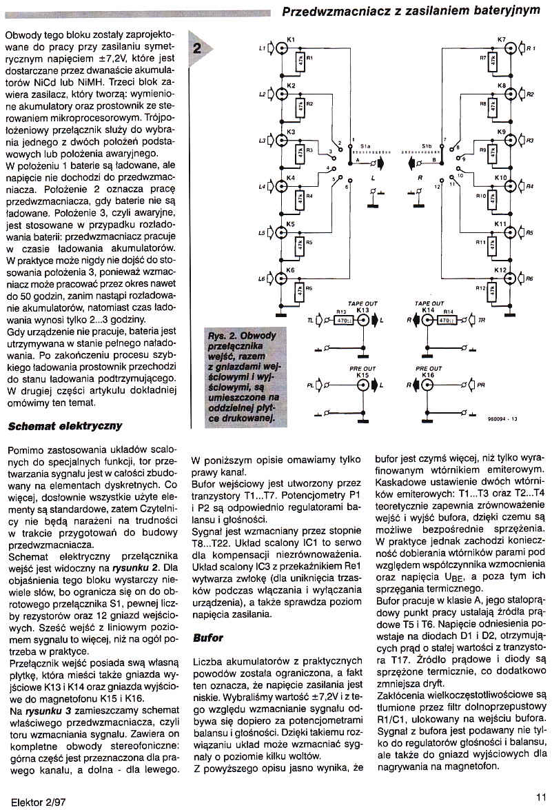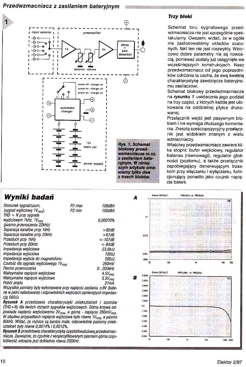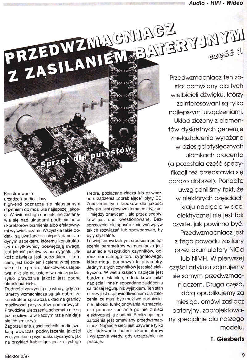 Przedwzmacniacz ten został pomyślany dla tych wielbicieli dźwięku, którzy zainteresowani są tylko najlepszymi urządzeniami. Układ złożony z elementów dyskretnych generuje zniekształcenia wyrażane w dziesięciotysięcznych ułamkach procenta (a pozostała część specyfikacji też przedstawia się bardzo dobrze!). Ponadto uwzględniliśmy fakt, że w niektórych częściach kraju napięcie w sieci elektrycznej nie jest tak czyste, jak powinno być. Przedwzmacniacz jest z tego powodu zasilany przez akumulatory NiCd lub NiMH. W pierwszej części artykułu zajmujemy się samym przedwzmacniaczem. Druga część, którą opublikujemy za miesiąc, omówi zasilacz bateryjny, zaprojektowany specjalnie dla naszego modelu.