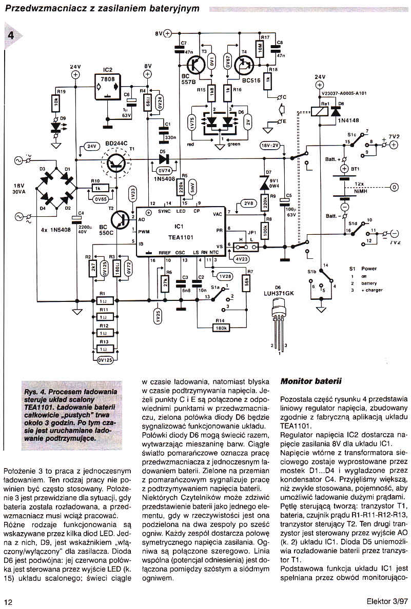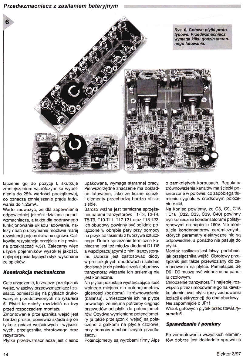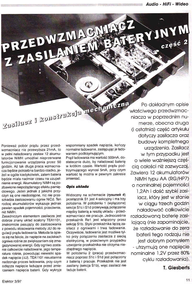 Po dokładnym opisie właściwego przedwzmacniacza w poprzednim numerze, obecna druga (i ostatnia) część artykułu dotyczy zasilacza oraz budowy kompletnego urządzenia. Zasilacz w tym przypadku jest o wiele ważniejszą częścią całości niż zazwyczaj. Zawiera 12 akumulatorów NiMH typu AA (RG/HP7) o nominalnej pojemności 1,2Ah i dość szybki zasilacz, któy jest w stanie w ciągu trzech godzin naładować całkowicie rozładowaną baterię zasilającą (nie zapominajcie, że rozładowanie do zera baterii tego rodzaju nie jest dobrym pomysłem - utrzymują one napięcie nominalne 1,2V przez 80% cyklu rozładowania).