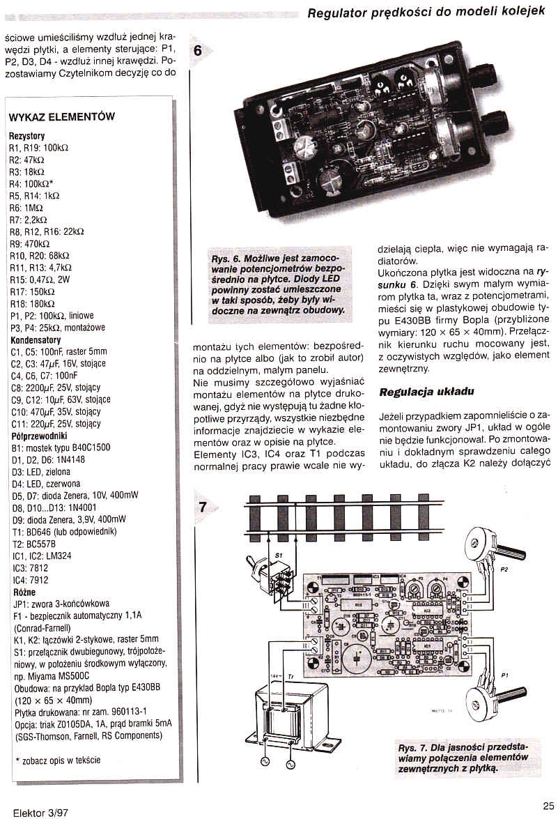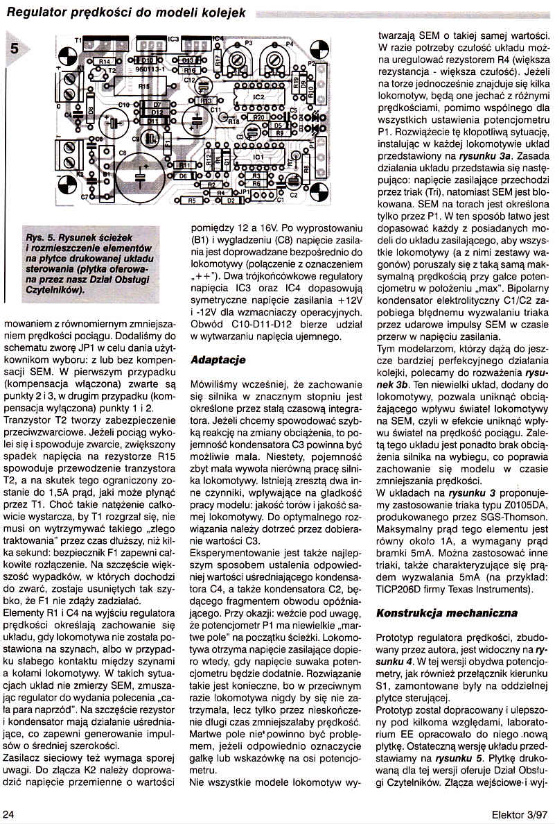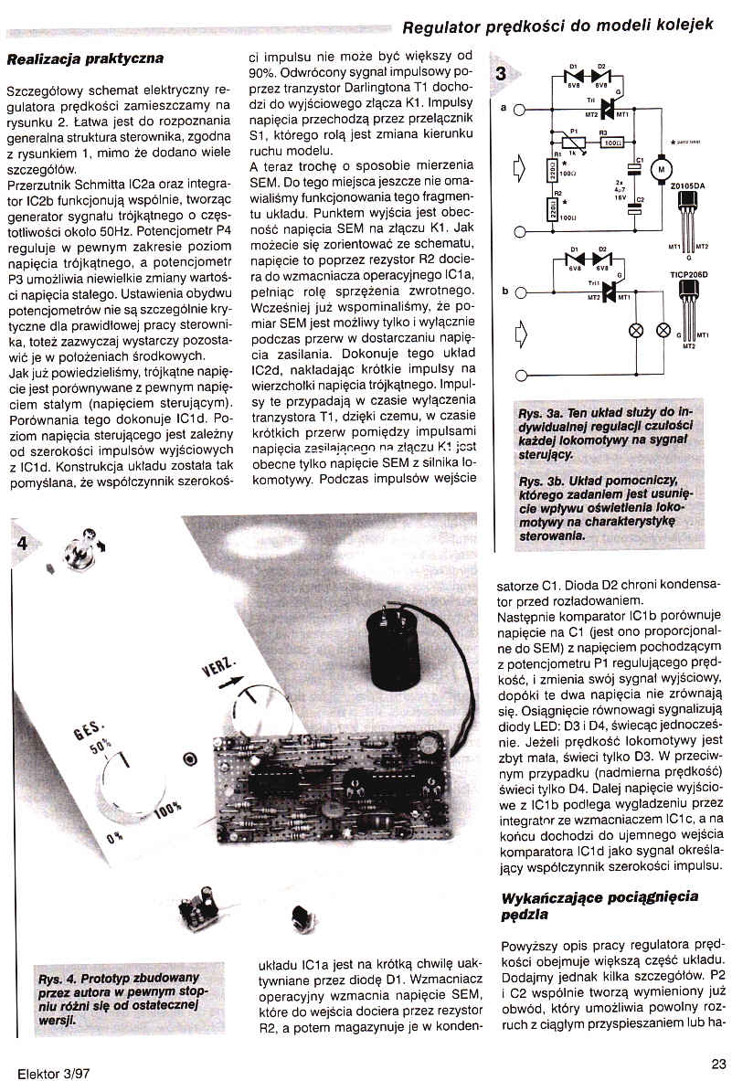 Modelarze "kolejowi" bardzo rzadko spotykają regulatory prędkości z idealną charakterystyką. W większości konstrukcji prędkość modelu jest zależna od obciążenia lokomotywki. Próby polepszenia tej denerwującej sytuacji często powodują utratę ciągu. Silnik lokomotywy w czasie pracy generuje siłę elektromotoryczną (SEM). Przedstawiamy układ, który wykorzystuje tę siłę jako sygnał korekcyjny dla systemu regulacji szerokości impulsu. W praktycznym zastosowaniu metoda ta powoduje bardzo skuteczną kompensację zmian obciążenia, a jej widocznym skutkiem jest utrzymywanie stałej prędkości z dużą dokładnością.