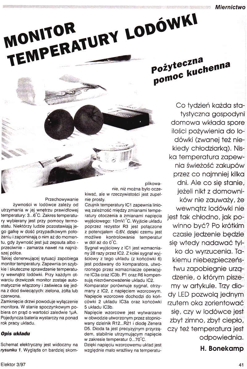 Co tydzień każda statystyczna gospodyni domowa wkłada spore ilości pożywienia do lodówki (zwanej też niekiedy chłodiarką). Niska temperatura zapewnia świeżość zakupów przez co najmniej kilka dni. Ale co się stanie, jeżeli nikt z domowników nie zauważy, że wewnątrz lodówki nie jset tak chłodno, jak powinno być? Po krótkim czasie jedzenie bedzie się wtedy nadawać tylko do wyrzucenia. Takiemu niebezpieczeństwu zapobiegnie urządzenie, o którym piszemy w artykule. Trzy diody LED pozwolą jednym rzutem oka zorientować się, czy w lodówce jest zbyt zimno, zbyt ciepło, czy też temperatura jest odpowiednia.