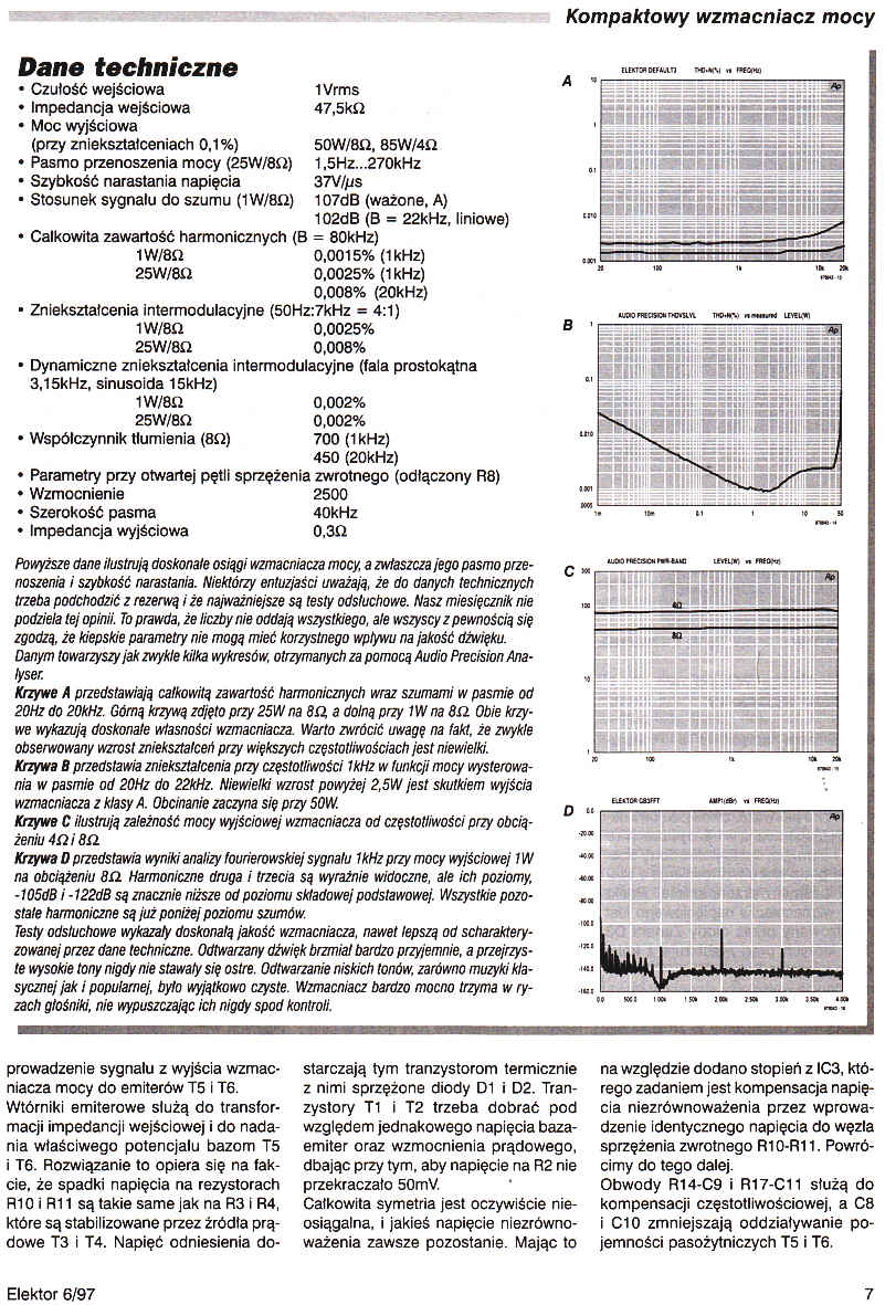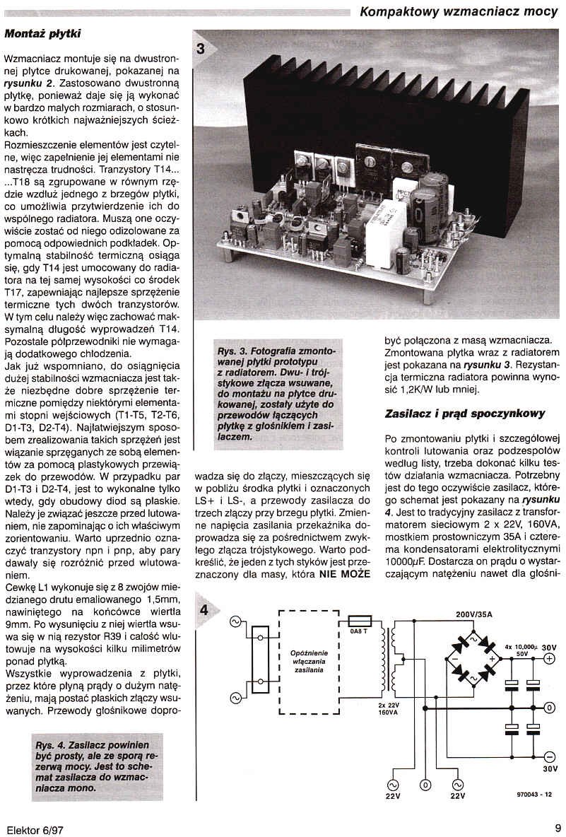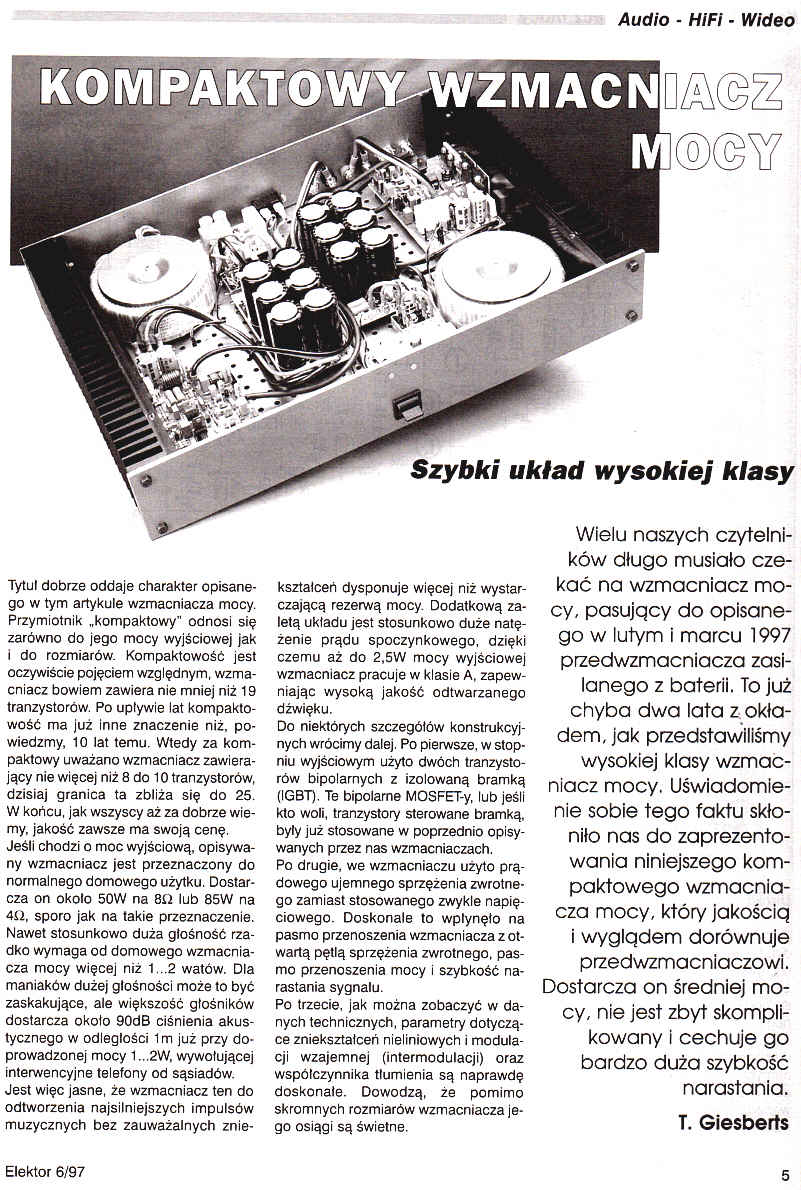 Prezentowany kompaktowy wzmacniacz mocy jakością i wyglądem dorównuje przedwzmacniaczowi z zasilaniem bateryjnym opisanemu przez nas w lutym i marcu 1997. Dostarcza on średniej mocy, nie jest zbyt skomplikowany i cechuje go bardzo duża szybkość narastania. - Audio - HiFi - Wideo