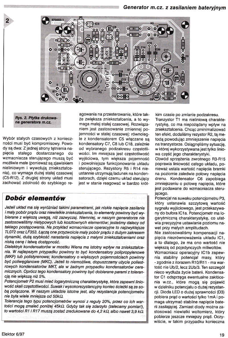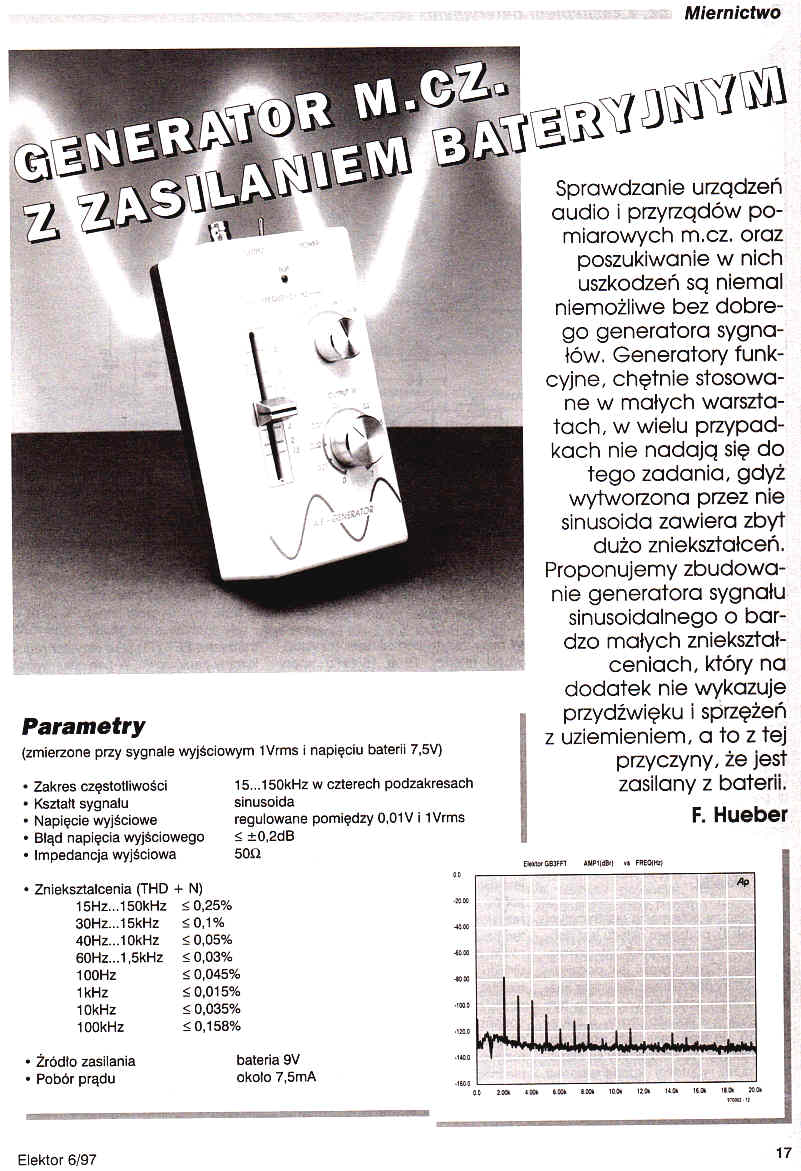 Sprawdzanie urządzeń audio i przyrządów pomiarowych m.cz. oraz poszukiwanie w nich uszkodzeń są niemal niemożliwe bez dobrego generatora sygnałów. Generatory funkcyjne, chętnie stosowane w małych warsztatach, w wielu przypadkach nie nadają się do tego zadania, gdyż wytworzona przez nie sinusoida zawiera zbyt dużo zniekształceń. Proponujemy zbudowanie generatora sygnału sinusoidalnego o bardzo małych zniekształceniach, który na dodatek nie wykazuje przydźwięku i sprzężeń z uziemieniem, a to z tej przyczyny, że jest zasilany z baterii.