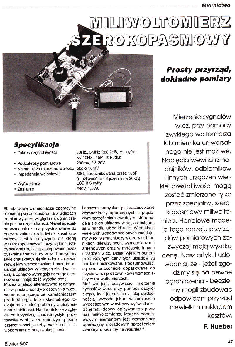 Mierzenie sygnałów w.cz. przy pomocy zwykłego woltomierza lub miernika uniwersalnego nie jest możliwe. Napięcia wewnątrz nadajników, odbiorników i innych urządzeń wielkiej częstotliwości mogą zostać zmierzone tylko przez specjalny, szerokopasmowy miliwoltomierz. Handlowe modele tego rodzaju przyrządów pomiarowych zazwyczaj mają wysoką cenę. Nasz artykuł udowadnia, że - jeżeli zgodzimy się na pewne ograniczenia - będziemy mogli zbudować odpowiedni przyrząd niewielkim nakładem kosztów.