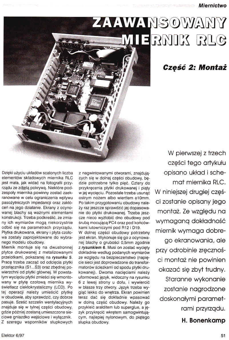 W pierwszej z trzech części tego artykułu opisano układ i schemat miernika RLC. W niniejszej drugiej części zostanie opisany jego montaż. Ze względu na wymaganą dokładność miernik wymaga dobrego ekranowania, ale przy odrobinie zręczności montaż nie powinien okazać się zbyt trudny. Staranne wykonanie zostanie nagrodzone doskonałymi parametrami przyrządu.