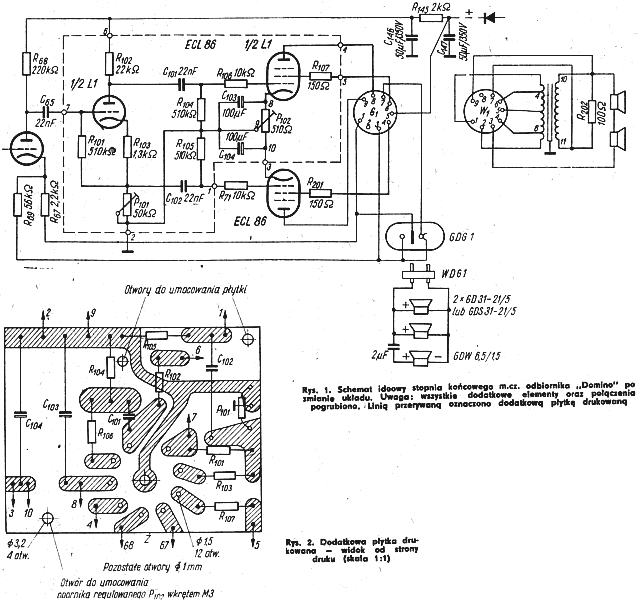 Dla tych radioamatorów, którzy ze względów finansowych lub technicznych nie mogli sobie pozwolić na montaż wzmacniacza o mocy około 10VA, proponuje prostą i tanią przeróbkę odbiornika radiowego "Domino", który przy dobrych parametrach elektrycznych ma stosunkowo małą moc wyjściowa (około 2 VA), w wielu przypadkach niewystarczającą, zwłaszcza gdy dysponujemy zestawem głośnikowym o większej mocy i dobrych parametrach elektroakustycznych.