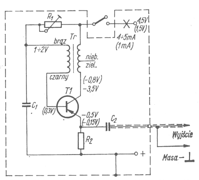 Przyrząd składa się ze wzmacniacza m.cz., na wyjściu którego włączona jest słuchawka (telefoniczna) lub mały głośnik z odpowiednim transformatorem wyjściowym. Do wejścia szukacza może być doprowadzony zarówno sygnał wielkiej częstotliwości jak i sygnał o częstotliwości akustycznej. Czułość reguluje się potencjometrem R2. Detekcję sygnałów w.cz. zapewnia dioda D1.