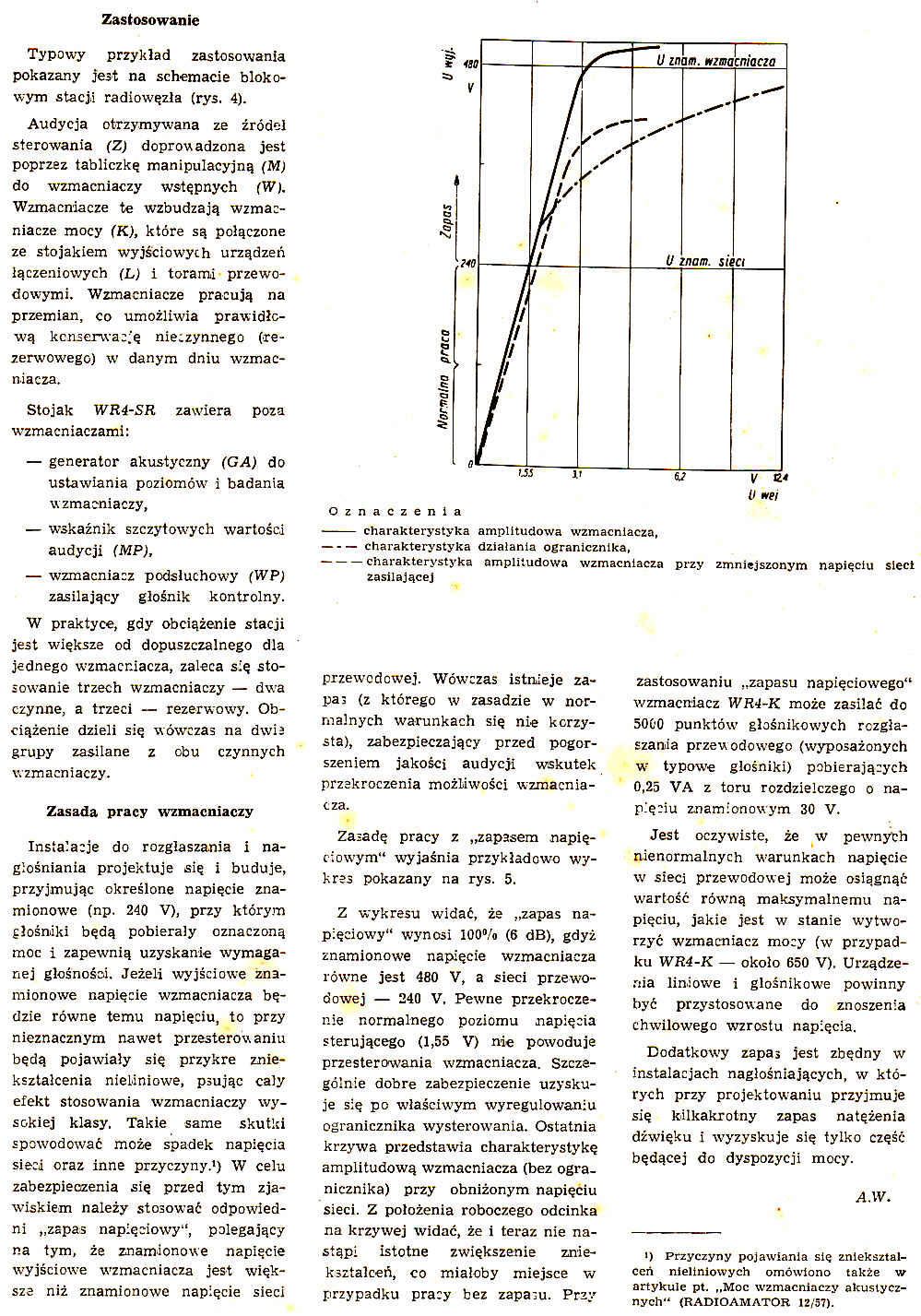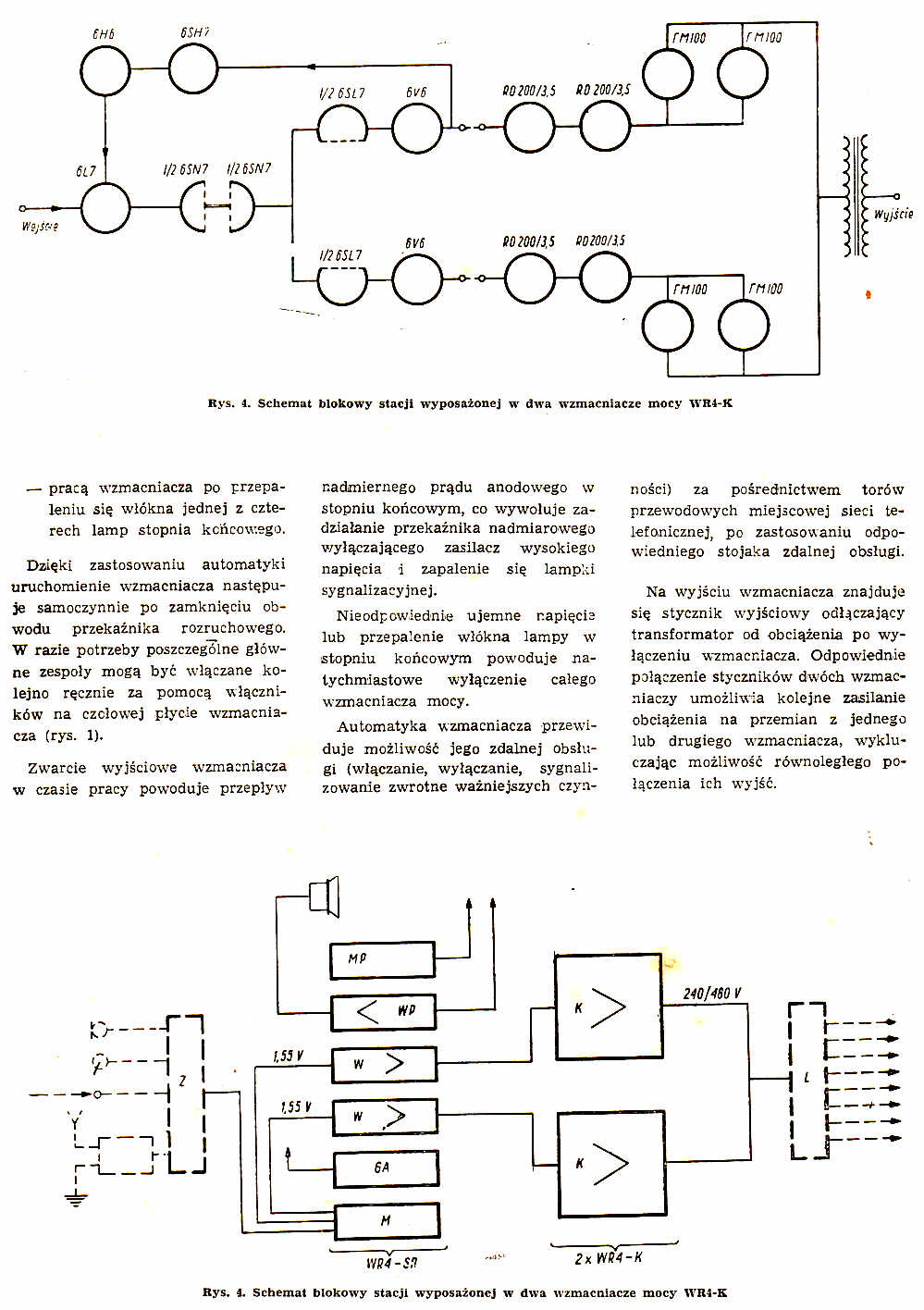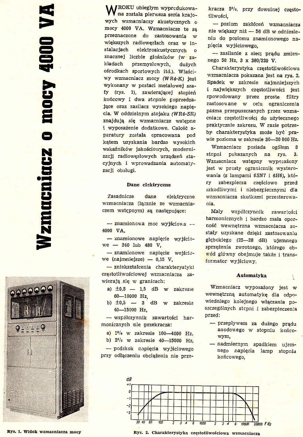 W roku ubiegłym wyprodukowana została pierwsza seria krajowych wzmacniaczy akustycznych o mocy 4000VA. Wzmacniacze te są przeznaczone do zastosowania w większych radiowęzłąch oraz w instalacjach elektroakustycznych o znacznej liczbie głośników (w zakładach przemysłowych, dużych ośrodkach sportowych itd.). Właściwy wzmacniacz mocy (WR4-K) jest wykonany w postaci metalowej szafy zawierającej stopień końcowy i dwa stopnie poprzedzające oraz zasilacz wysokiego napięcia.