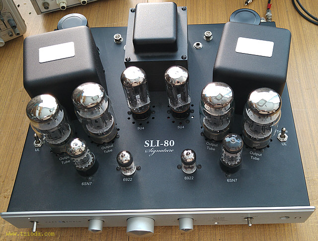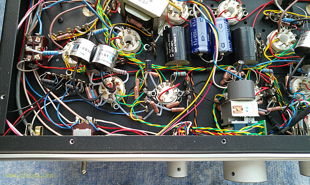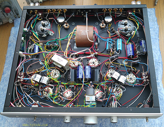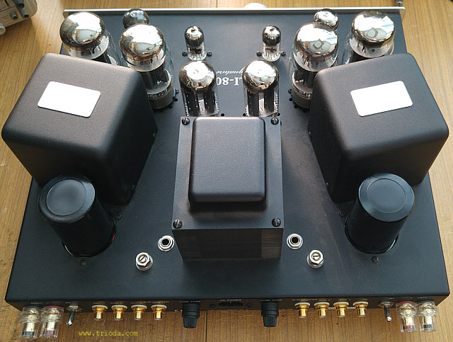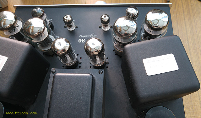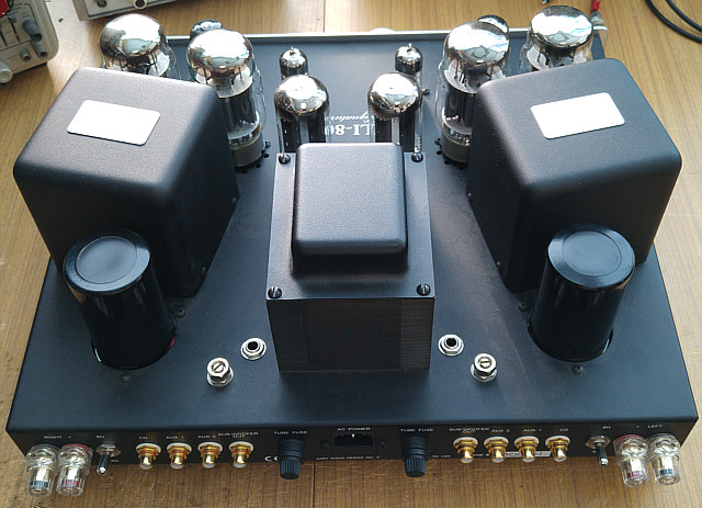 Wracając do rzeczy, jest to urządzenie w pełni lampowe - ma nawet diody próżniowe i jak na produkt pochodzący spoza Chin tradycyjnie nie mogłem znaleźć w Internecie jakiegokolwiek schematu ideowego umożliwiającego szczegółową analizę zastosowanych rozwiązań układowych bez konieczności zrysowania schematu z natury. Sam proces odtwarzania schematu jest całkiem przyjemny i ciekawy, ale pod warunkiem, że nie trzeba się spieszyć. W moim przypadku niestety nie zawsze stać mnie na ten luksus. Na Fot. 1 przedstawiony jest widok ogólny wzmacniacza. Wzmacniacz nie posiada fabrycznej osłony na lampy. Z estetycznego punktu widzenia to bardzo dobrze, bo całość, razem z ustawionymi pod kątem transformatorami głośnikowymi prezentuje się wspaniale. Troszkę szkoda, że obudowy transformatora sieciowego i głośnikowych nie są ujednolicone.