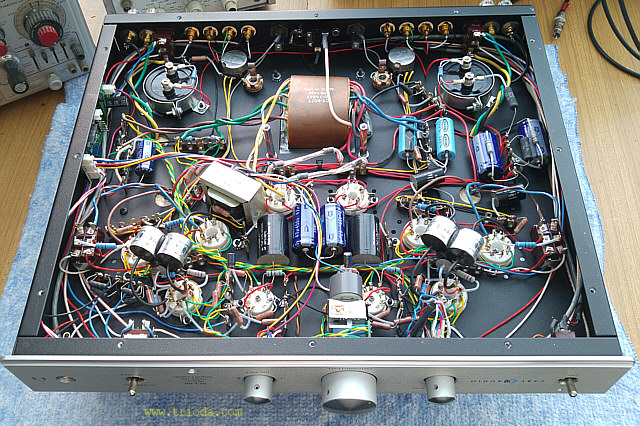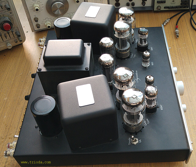 Jak widać na fotografiach wzmacniacz wyposażony jest w dwa potencjometry regulacyjne, po jednym na każdy kanał. To oznacza, że prawidłowy (jednakowy) podział prądu pomiędzy lampy każdego kanału wymaga zastosowania lamp o dobranych parametrach (potrzebne są dwie pary lamp mocy).