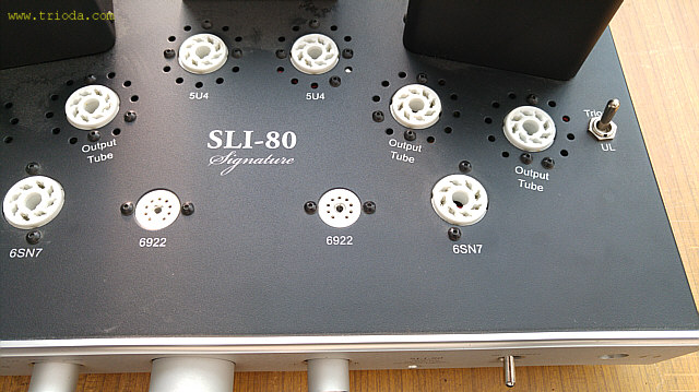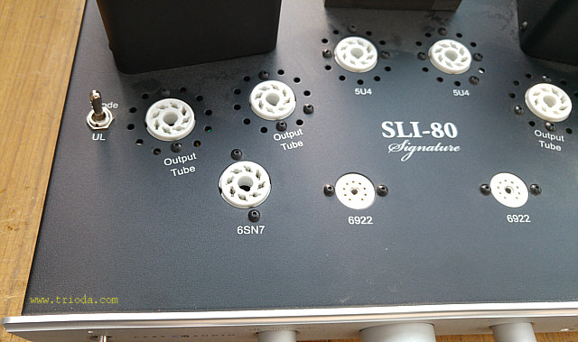 Stopień mocy wzmacniacza może pracować w trybie triodowym jak i ultralinearnym. Przełączanie trybu pracy odbywa się niezależnie dla każdego kanału takimi oto przełącznikami hebelkowymi (Fot. 9).