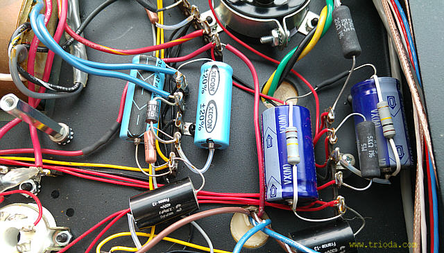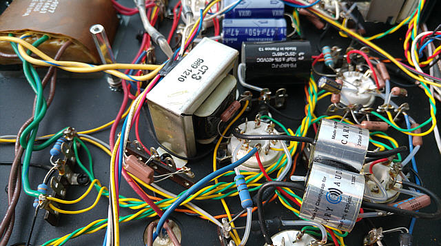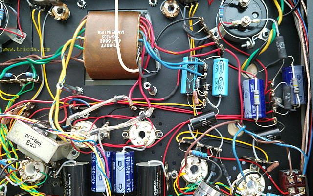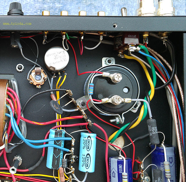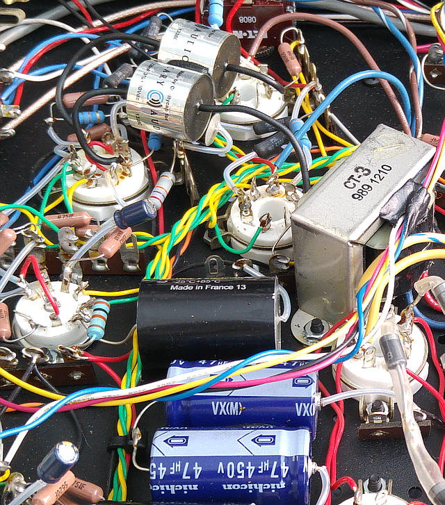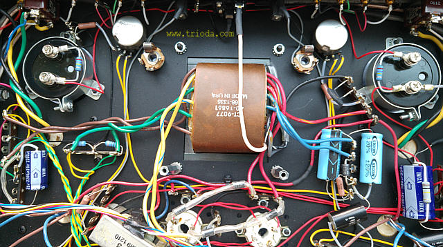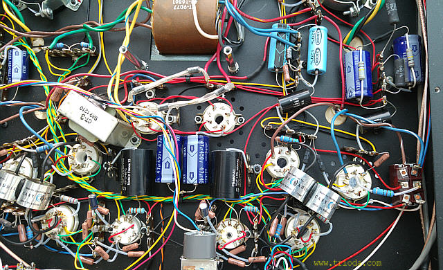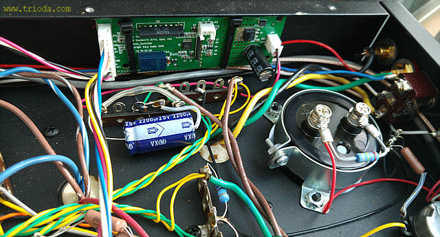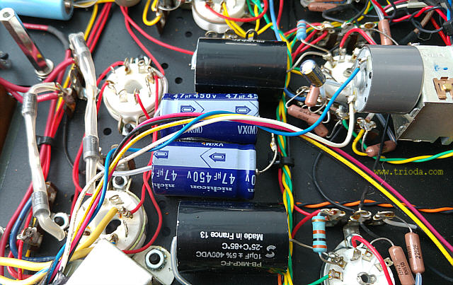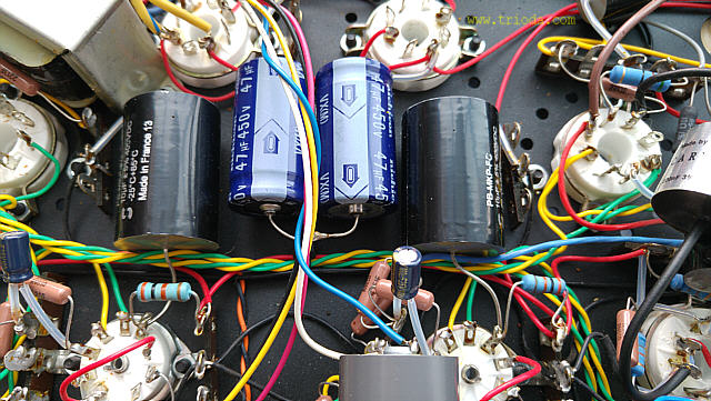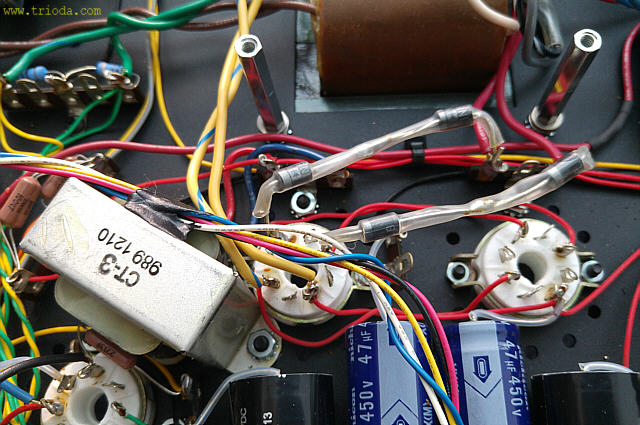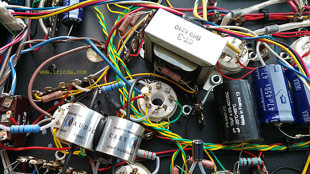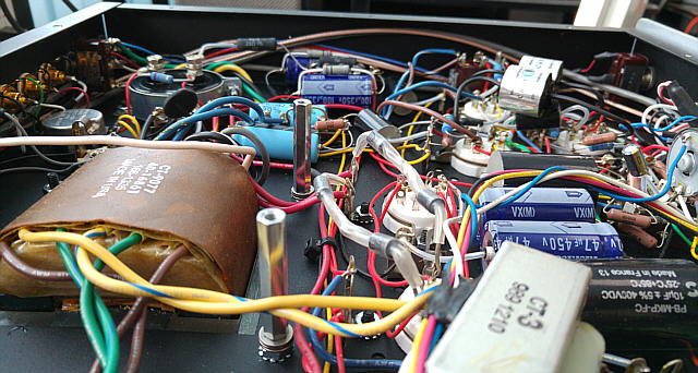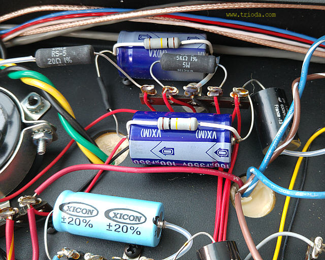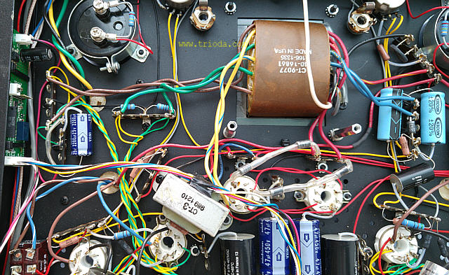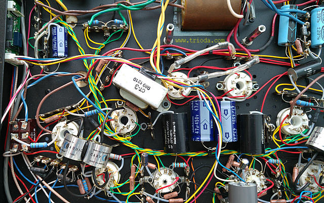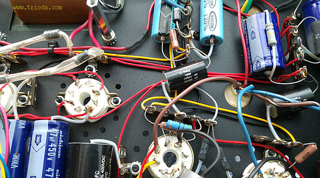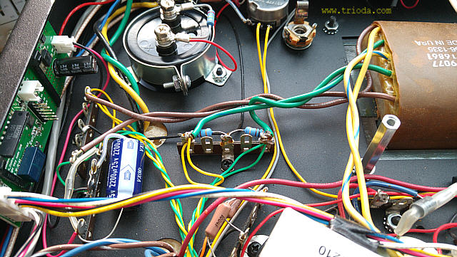 Na Fot. 44 w centralnej części widoczny jest układ wytwarzający ujemne napięcie polaryzacji siatek sterujących lamp końcowych. Składa się z prostownika jednopołówkowego i filtru CRC. Drugi kondensator filtru (elektrolityczny o wartości 47μF/350V) jest dodatkowo zbocznikowany kondensatorem polipropylenowym MKP (2μF/400V), zaś rezystor w filtrze to DALE stosowany np. w układach elektronicznych w samolotach wojskowych, że o układach audiofilskich nie wspomnę. Jak widać producent nie oszczędzał na jakości elementów.
