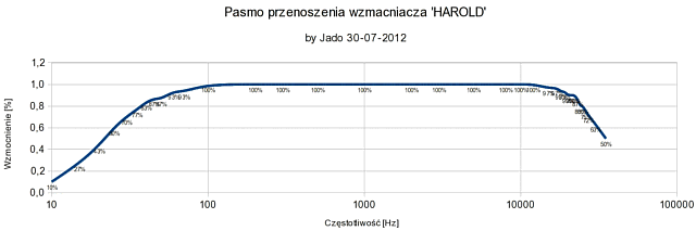 Po zrobieniu dokładniejszych pomiarów charakterystyki przenoszenia wzmacniacza otrzymałem następujący wykres: