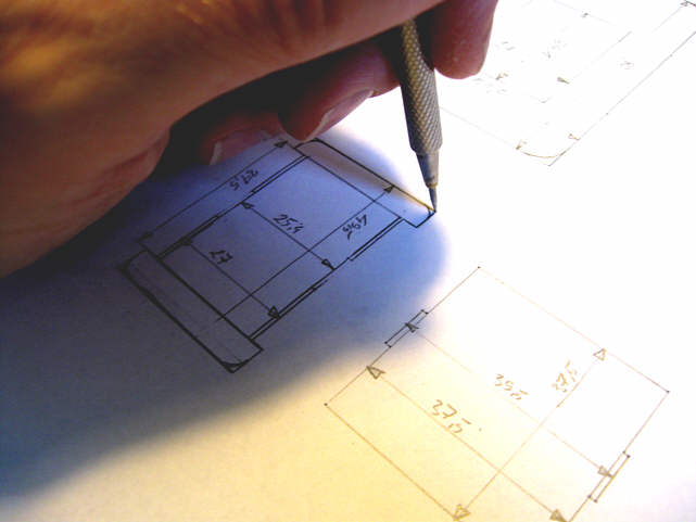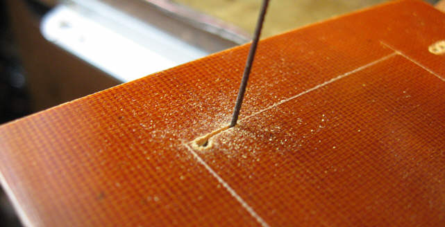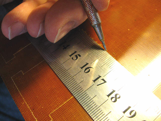 Mając już projekt, musiałem go przenieść na płytkę tekstolitową. Ponieważ mamy tu do czynienia z kątami prostymi, wystarczającą okazała się metoda "nakłuwania" - każdy róg rysunku nakłułem więc ostrym narzędziem (rysik, igła).