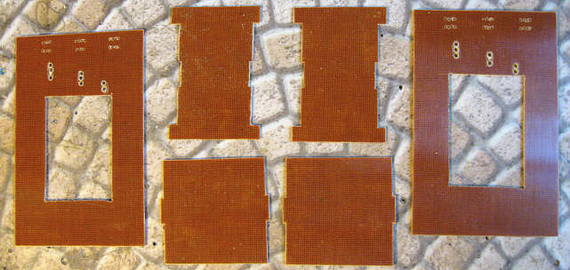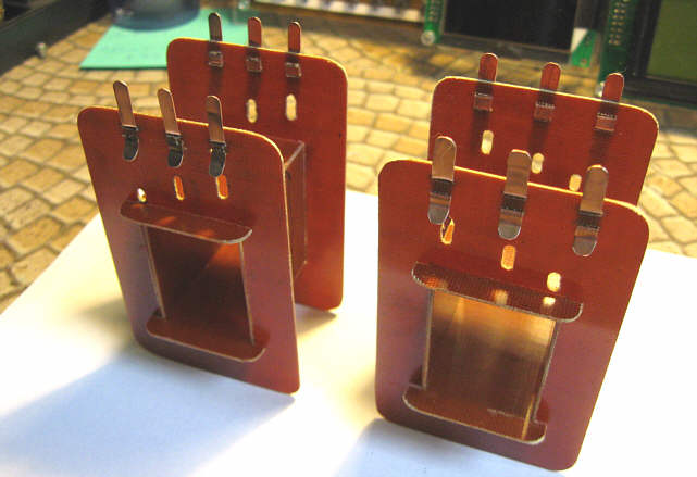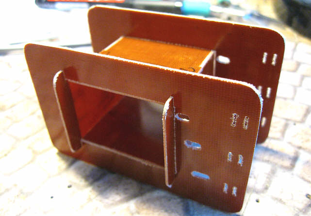 Ponieważ szczęśliwie posiadałem płytę z cienkiego (0,8 mm) tekstolitu, postanowiłem jej użyć jako materiału na karkas transformatorów. Można użyć też trochę grubszego tekstolitu (1-1,5 mm), co daje większą wytrzymałość karkasu, ale zmniejsza to powierzchnię okna gdzie mają się zmieścić uzwojenia. Zamiast tekstolitu można zastosować też cienki laminat szklano-epoksydowy (bez miedzi). Dawniej często był stosowany również przeszpan. Ale wracajmy do opisu...
