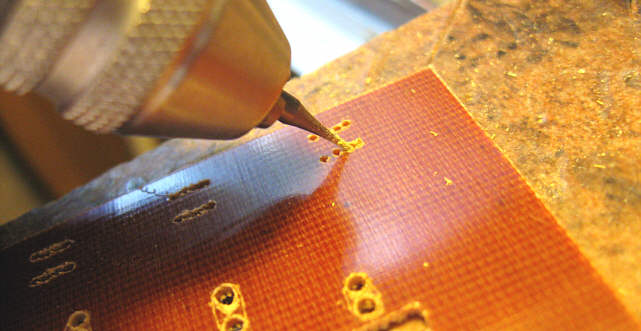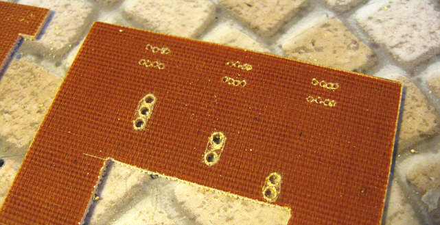 W miejscach gdzie były przewidziane podłużne wąskie szczeliny na końcówki lutownicze oraz wyprowadzenia końców uzwojeń, początkowo nawierciłem otwory - gęsto jeden przy drugim, wzdłuż linii szczeliny.