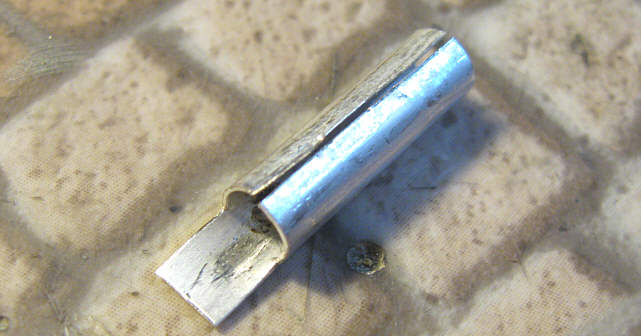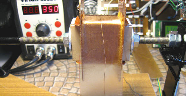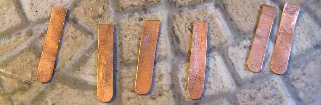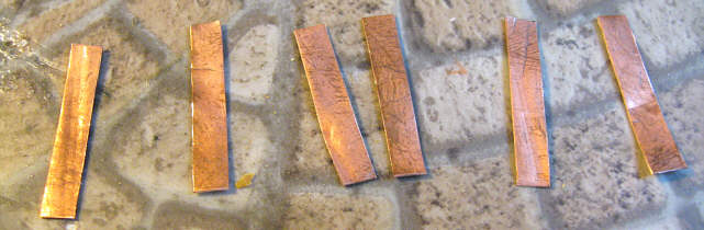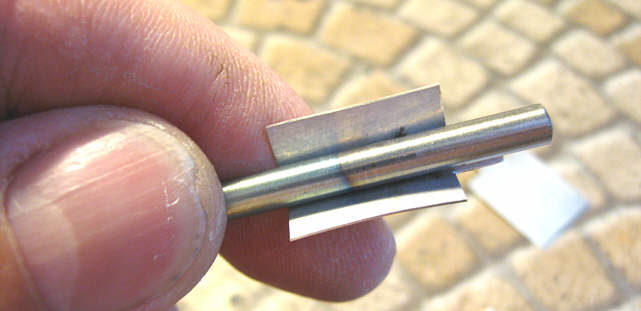 Pozostały do zrobienia końcówki lutownicze. Użyłem cienkiej blaszki miedzianej o grubości 0,3 mm, którą akurat dysponowałem - można użyć też mosiężnej czy innej podobnej, byle nie była zbyt twarda i dała się lutować (w razie czego blaszkę można wyżarzyć).