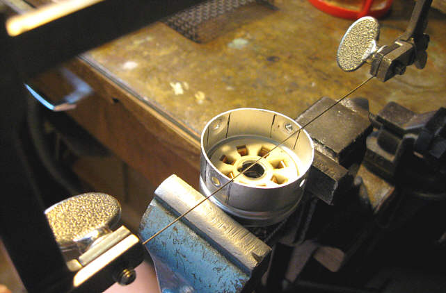 A potem połączyłem otwory w jedną całość wycinając materiał pomiędzy nimi za pomocą frezu miniaturowego (szpilkowego) napędzanego miniwiertarką typu "Dremel".