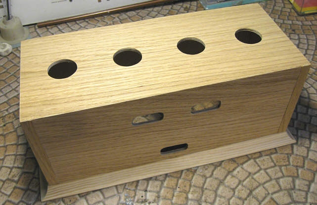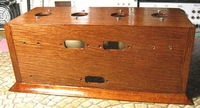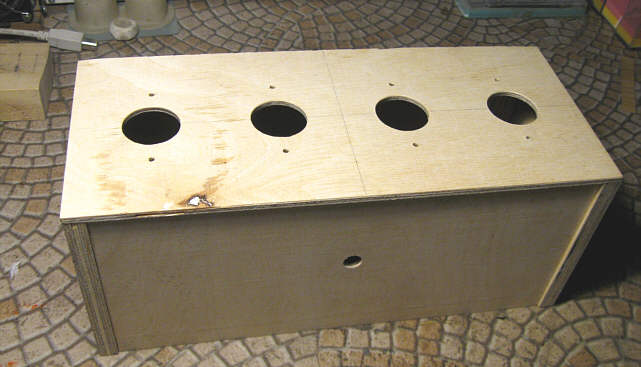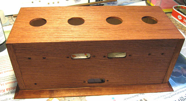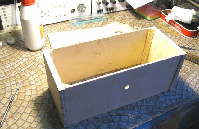 Po powrocie do domu usiadłem do rozplanowywania położenia podstawek lampowych, złącz i elementów regulacyjnych na każdej ze ścianek. Musiałem powycinać włosówką wszystkie otwory zanim przystąpię do sklejania pudełka, bo potem nie będzie dobrego dojścia. W sumie nie jest ich dużo, a materiał miękki, więc robota nie była zbyt uciążliwa.