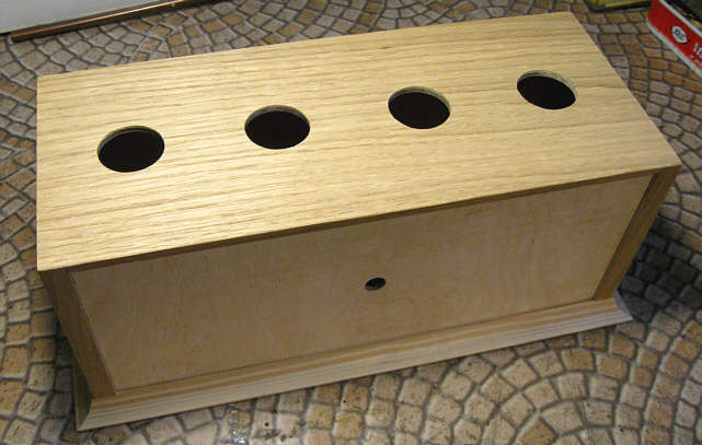 Szczęśliwie wpadłem na pomysł, żeby zapytać stolarza o fornir. Okazało się, że ma na oknie całą stertę dębowego forniru, grubo porytego kurzem – chyba NIKT dawno do niego nie zaglądał. Jeden płat forniru kosztował 15 zł, więc do przyjęcia – zawsze się przyda na następne może jakieś konstrukcje. Tak więc boczki poszły ze sklejki, jak i pozostałe ścianki obudowy.
